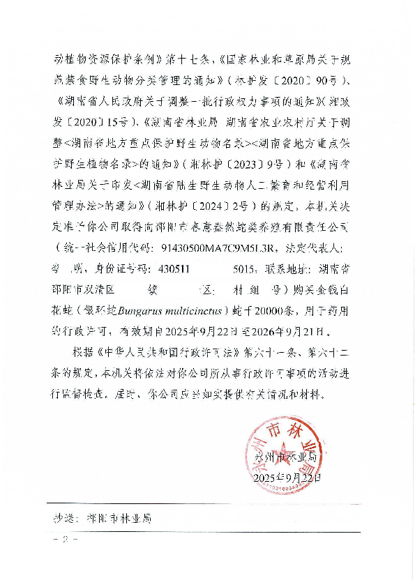 永林护许【2025】15号关于准予永州市众信中药饮片有限公司收购、利用药用蛇类产品的行政许可决定书