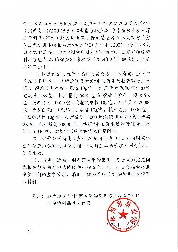 永林护许〔2025】19号关于准予湖南永州异蛇生物制药有限公司利用药用蛇类产品的行政许可决定书